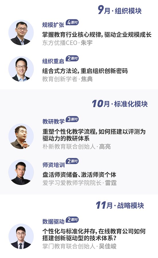 1.2020秋季课程,正在逐步直播开讲。10位具备教育行业10年以上的创业经验的CEO或者身经百战的核心高管,在线授课、答疑,当场解决你的经营难题;