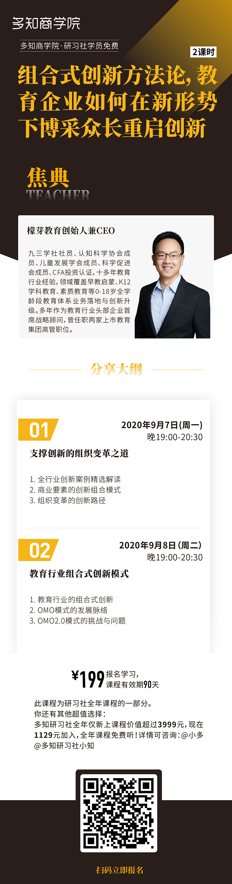 【教育机构组合式创新方法论】专题课,9月7日(周一)晚7点准时线上开讲!