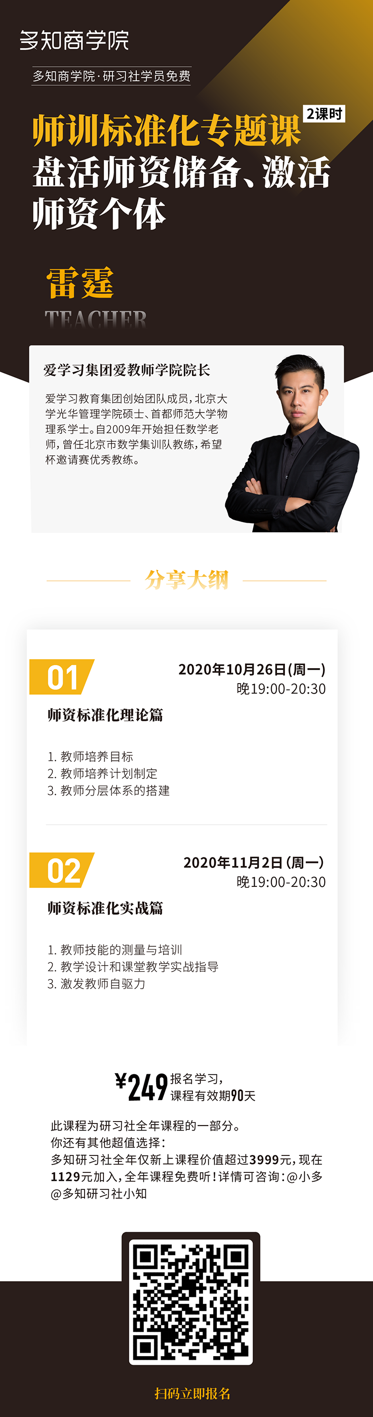 本次专题课将从教师的培养目标和具体计划制定讲到教师分层体系的搭建,给出师资标准化的基础理论。同时,导师雷霆还将结合落地实战,讲授教师培训的测量、培训策略,并对教学设计实战进行指导,激发教师自驱力。