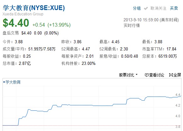 多知网9月11日消息,学大教育股票昨晚暴涨13.99%,报收于4.40美元,这也是近两年来学大股价的高点。