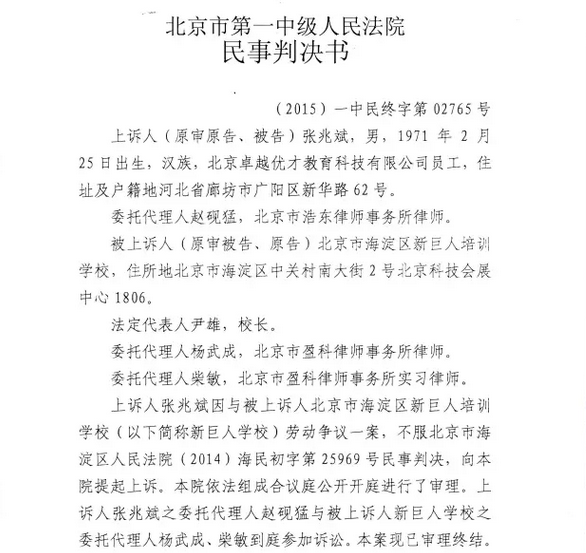去年2月19日,巨人教育发出内部通报,称巨人集团副总裁、北京分校校长胡迪等三人,利用职务之便窃取商业信息,并注册公司从事同类竞争业务,董事会研究决定,通报开除,解除劳动合同关系并依法追究法律责任。