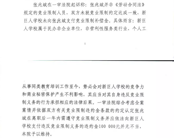 根据启迪巨人官方披露的内容,法院判定胡迪、孙树涛、吕飞三人私自注册的同类竞争业务公司卓越优才教育,旗下十名教师张兆斌、赵昱、刘剑、宋涵希、丁凯、李萌、李泉、赵国智、饶海波、侯莹违反《知识产权保护和竞业禁止协议》,他们须继续履行合同规定的竞业限制,直到期满,累计向巨人学校赔付金额不低于100万元人民币的赔偿款。