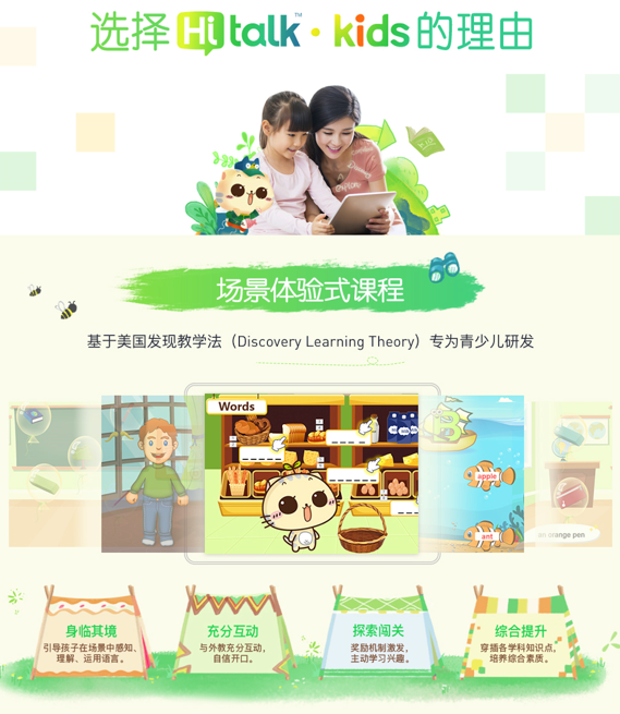 其中,在教材和课程体系方面,Hitalk kids获得了剑桥大学出版社旗下《Guess What!》(新版剑桥少儿英语)、《Connect》(剑桥国际英语青少版)等系列原版读物的授权与线上研发和传播授权。在教学方式层面,基于美国发现教学法,Hitalk kids根据教材重新研发和设计了在线少儿英语直播课,同时还设计了生活场景、趣味任务关卡等内容。而除了欧美外教一对一的在线口语主修课程,Hitalk kids还设置了一系列以美国州立小学课程为基础的绘本辅修课程。