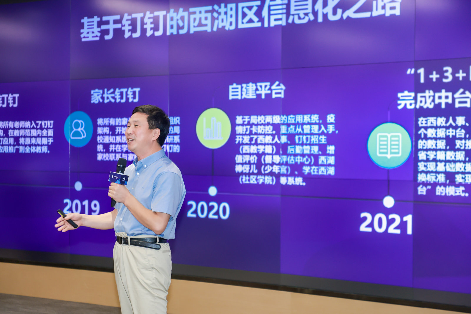 杭州市西湖区教育信息中心主任郤云江在会上介绍了西湖区教育局智慧教学解决方案,西湖区教育局基于钉钉底座打造了“1+3+N西湖数智教育整体架构”,打通现有系统数据,建设“局-校-师-生”一体化平台,实现了基于一个端的全教育场景应用;并给所有的教育参与者——教育主管部门、学校、老师、家长、学生提供了一个极其便利的数智教育底座和入口。上海宝山区教育局更是率先使用了基于专属钉钉的“未来宝”超级App终端,并通过举办多次宜搭低代码底座创新的教师低代码大赛,在提升教师的数字化素养的同时也培养了学校个性化应用的自建能力。