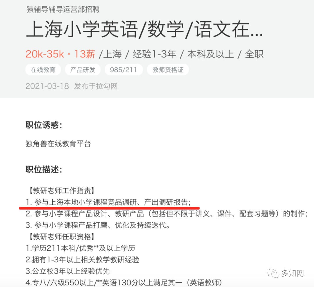 而在针对上海教师教研的招聘页面上显示,教研岗位需要参与上海本地小学课程竞品调研、产出调研报告。