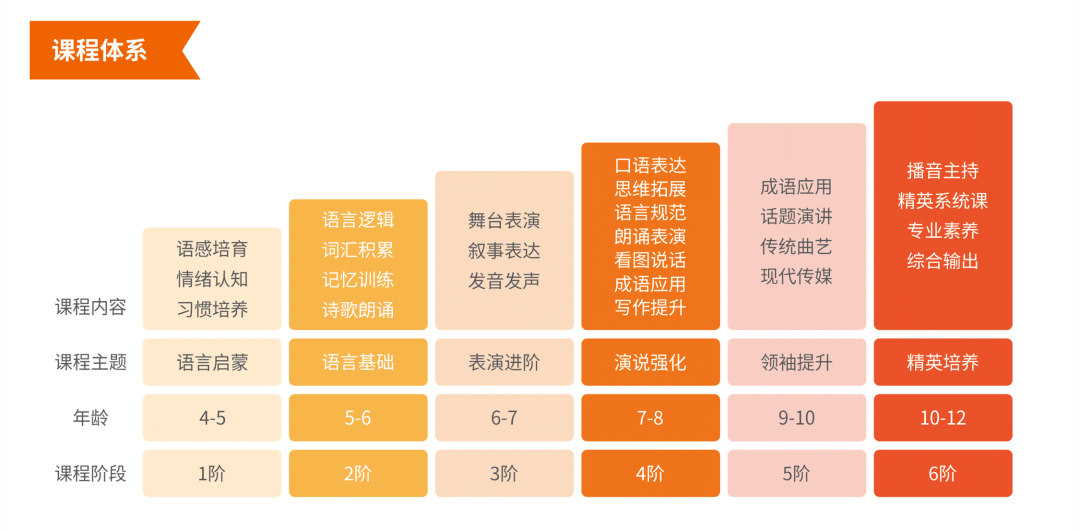 山果口才针对不同年龄段的孩子设立6个阶段的课程,课程围绕分为语言基础课和语言技能课两大板块内容展开。