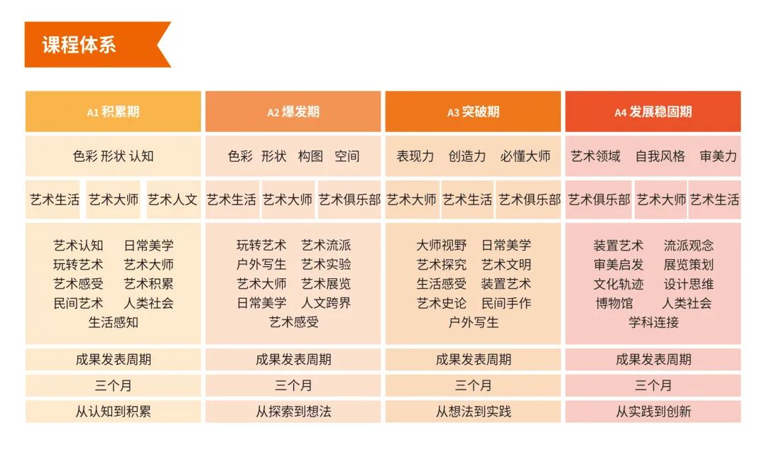 据了解,山果美育山果美育根据孩子的成长特性,将课程体系细分为:A1艺术积累期、A2爆发期、A3突破期、A4发展稳固期四个阶段。