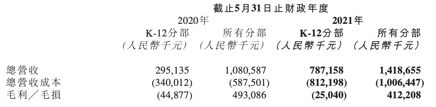 根据财报显示,截至2020年5月31日止,新东方在线的总营收为10.81亿元,总毛利润为4.93亿元;其中K12营收为2.95亿元,K12毛损失为4487.7万元;截至2021年5月31日止,新东方在线的总营收为14.19亿元,总毛利润为4.12亿元;其中K12营收为7.87亿元,K12毛损失为2504万元。