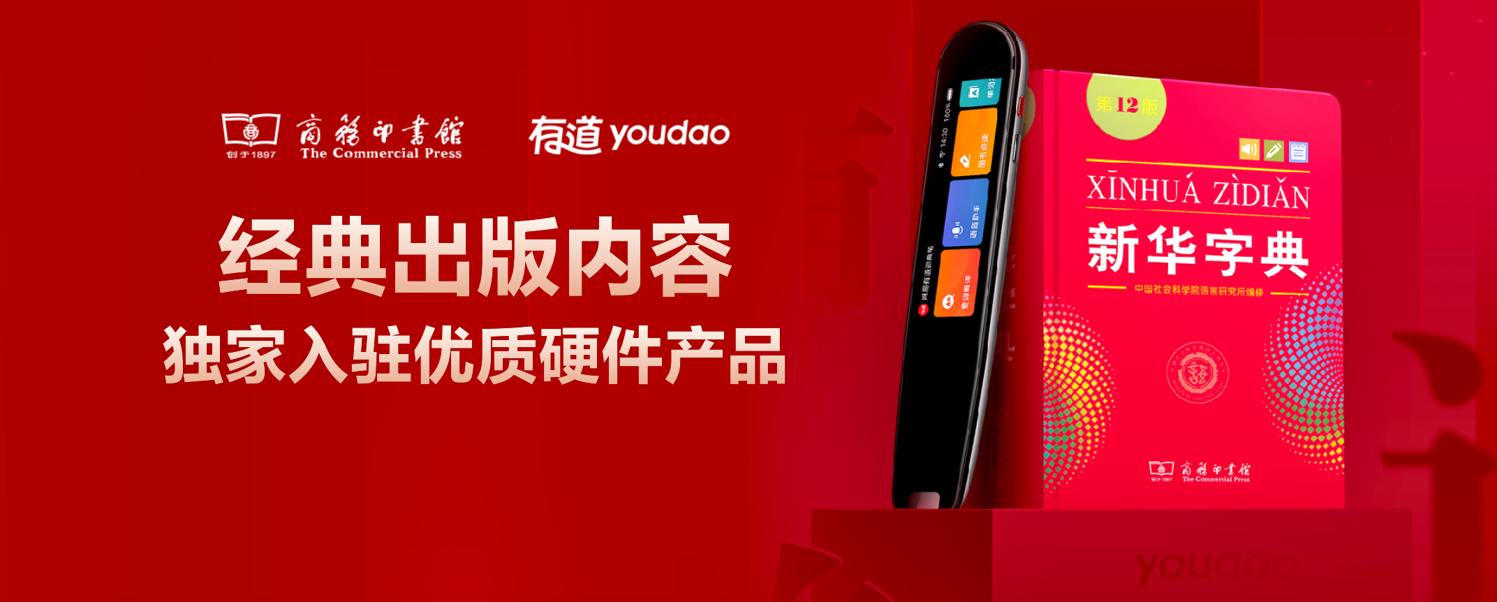 10月28日,智能学习公司网易有道与“百年老店”商务印书馆在北京达成战略合作,双方宣布将开启一系列深度合作。商务印书馆出版的《新华字典》《新华词典》《新华成语大词典》《古代汉语词典》《新华歇后语词典》等辞书内容将入驻网易有道智能硬件。其中,作为合作的第一步,《新华字典》将率先独家入驻有道词典笔旗舰版。