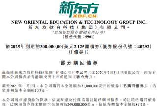 多知网11月4日消息,近日,新东方(09901.HK)发布公告称,截至2021年11月2日,新东方购回本金总额为3100万美元的债券,占债券初始本金额约10.3%。
