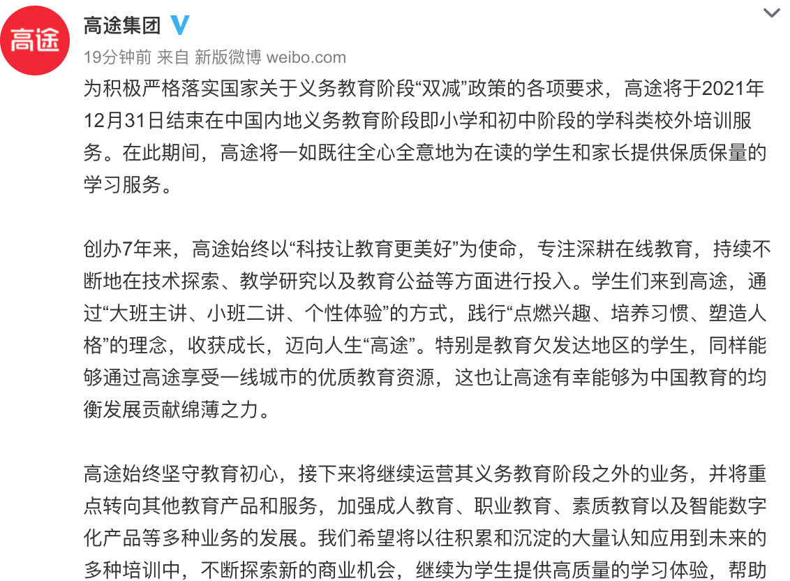 多知网11月15日消息,高途集团在IR网站和官方微博同时宣布,高途将于2021年12月31日结束在中国内地幼儿园、义务教育阶段即小学和初中阶段(K9阶段)的学科类校外培训服务。高途提到:“创办7年来,高途始终以“科技让教育更美好”为使命,专注深耕在线教育,持续不断地在技术探索、教学研究以及教育公益等方面进行投入。”