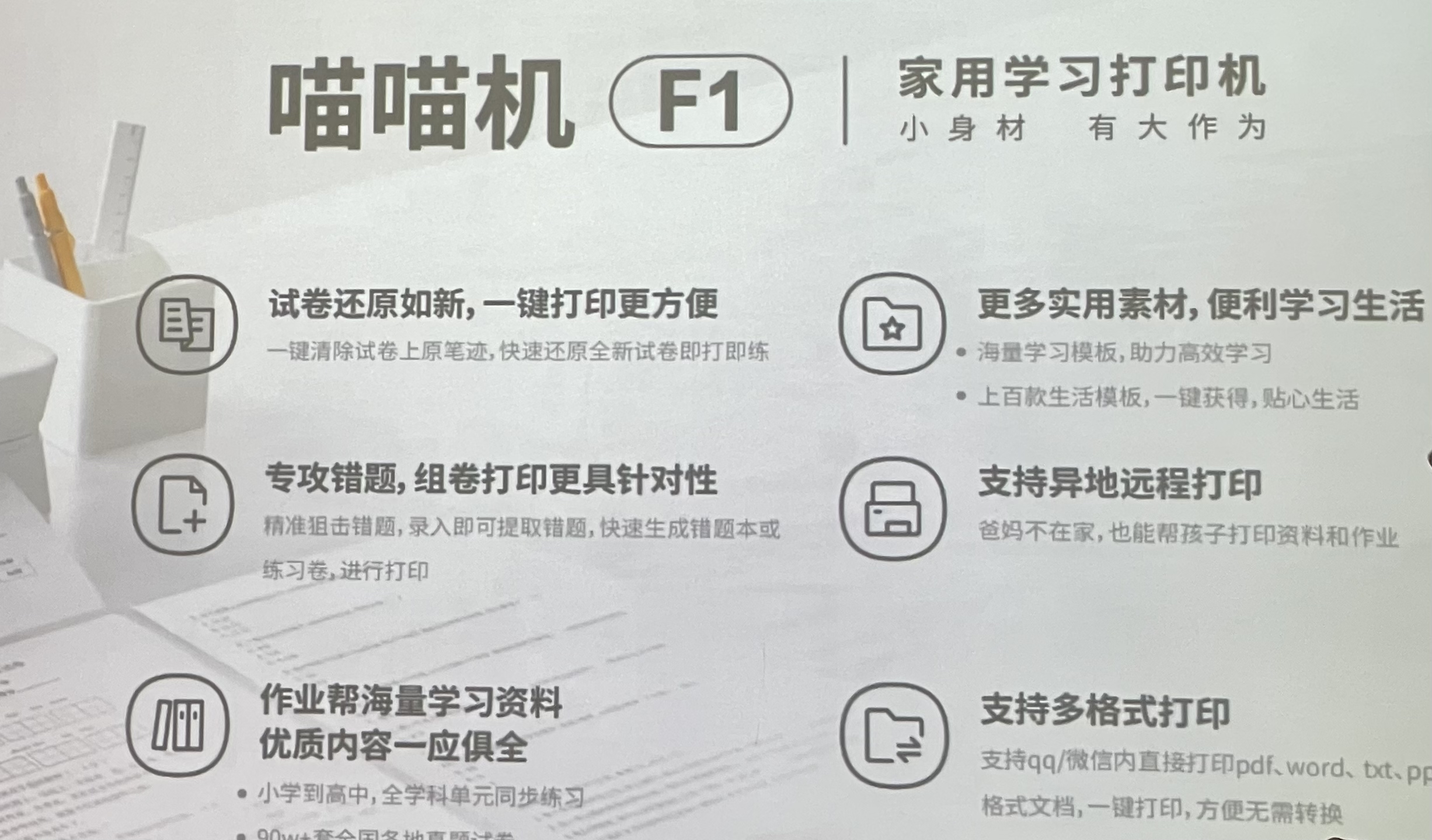 相比于以往的喵喵机,F1家用学习打印机针对家庭场景,外观方面,仅有一个电源键,简洁易用,重量仅3斤。硬件方面,与传统打印机相比,F1家用学习打印机采用热敏打印技术,免去换墨盒和碳粉,耗材仅是热敏纸,且不卡纸。软件方面,则基于作业帮教研基底,有丰富的学习资源。