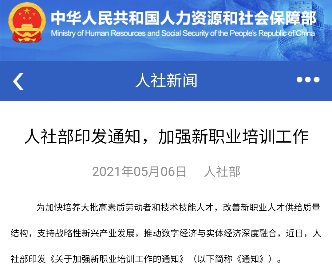 多知网5月7日消息,近日,人力资源和社会保障部印发《关于加强新职业培训工作的通知》(以下简称《通知》)。旨在加快培养大批高素质劳动者和技术技能人才,改善新职业人才供给质量结构,推动数字经济与实体经济深度融合。