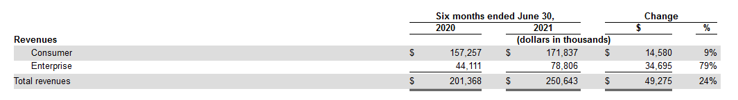 分业务板块来看,在截止2021财年6月30日的半年度中,C端业务的营收为1.72亿美元,同比增长1458万美元,同比增长约9%;B端业务营收额为7881万美元,比去年同期增长了3670万美元,同比增长了约79%。