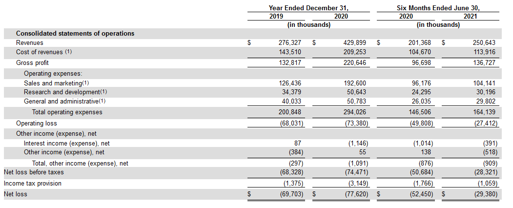 据招股书显示,Udemy在2020财年总营收达到4.30亿美元,同比增长55.6%;2020年毛利润为2.21亿美元,同比增加66.17%;在2020年Udemy仍然未达成盈利,2020年净亏损7762万美元,亏损同比扩大11.36%。