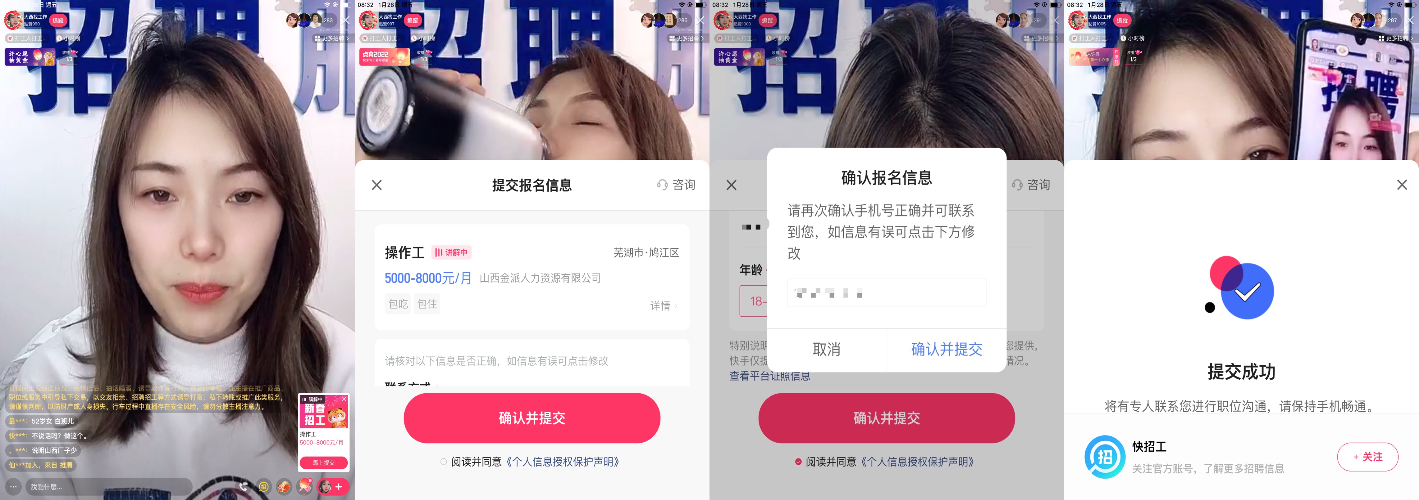 与传统招聘模式不同,“直播招聘”无需投递简历,只需留下联系方式,即可完成职位投递。简易化的操作更适合蓝领群体。