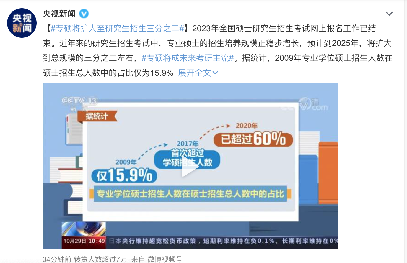 多知网10月29日消息,据央视新闻报道,2023年全国硕士研究生招生考试网上报名工作已结束。近年来的研究生招生考试中,专业硕士的招生培养规模正稳步增长,预计到2025年,将扩大到总规模的三分之二左右,专硕将成未来考研主流。