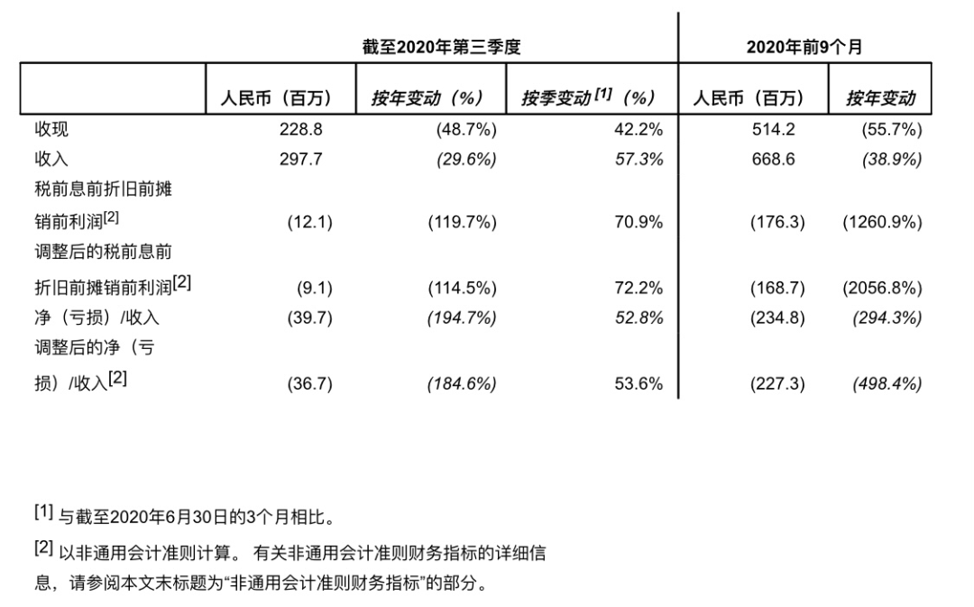2020年第三季度的净亏损为3,970万元人民币(约580万美元),而2019年第三季度的净收入为4,190万元人民币,2020年第二季度的净亏损为9,340万元人民币。