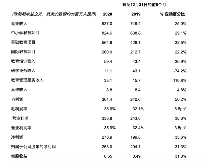 2021财年上半年,海亮教育的营业收入为9.370亿元(1.436亿美元),较去年同期的人民币7.494亿元增长25.0%。归属公司股东净利润为2.680亿元(4,107万美元),较去年同期的人民币2.041亿元增长31.3%。2021财年上半年,海亮教育的毛利率为38.6%,比去年同期提升了6.5个百分点。毛利率的增长主要得益学费水平和在校学生人数的持续增长、研学等较低毛利业务的收入占比下降,以及因疫情导致的2020财年一部分学费延至本财年确认所致。