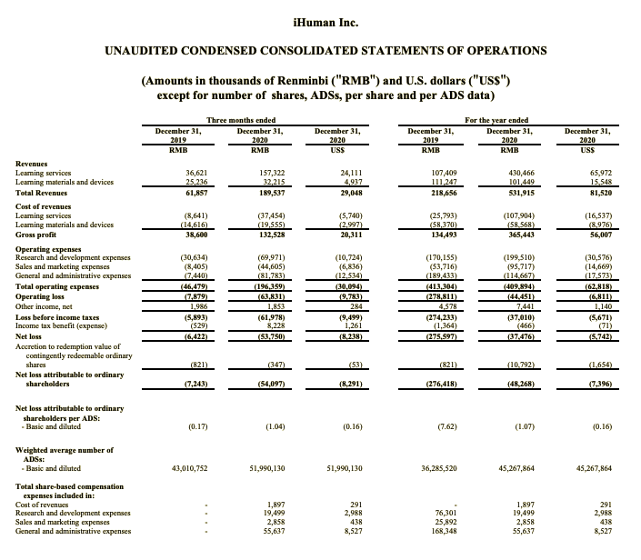 毛利为1.33亿元(2030万美元),较2019年第四季度的3806万元增长243.3%。毛利率为69.9%,2019年第四季度为62.4%。主要归因于学习服务业务的强劲增长,其毛利率更高。