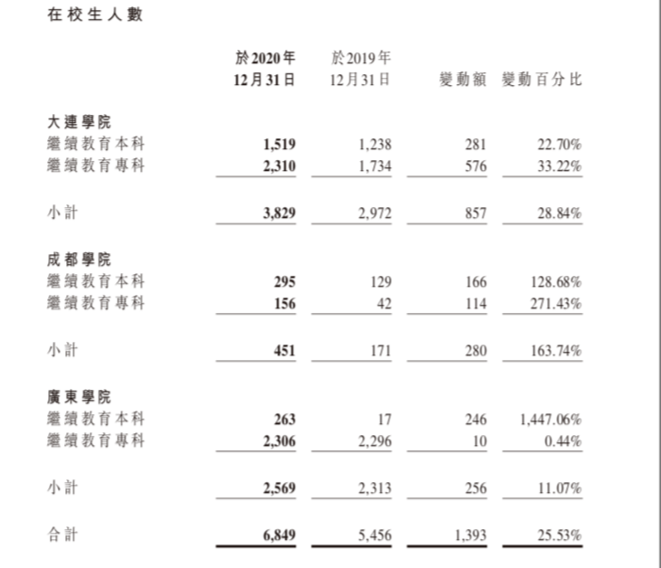 报告显示,截止2020年12月31日,公司的三所大学(大连学院、成都学院、广东学院)共有39242名在校学生,总体较2019年12月31日在校学生人数上升10.87%,2020/2021学年三所大学本专科平均报到率达到90%。录取分数线高于各自所在省份本科控制线,内生增长势头较强。