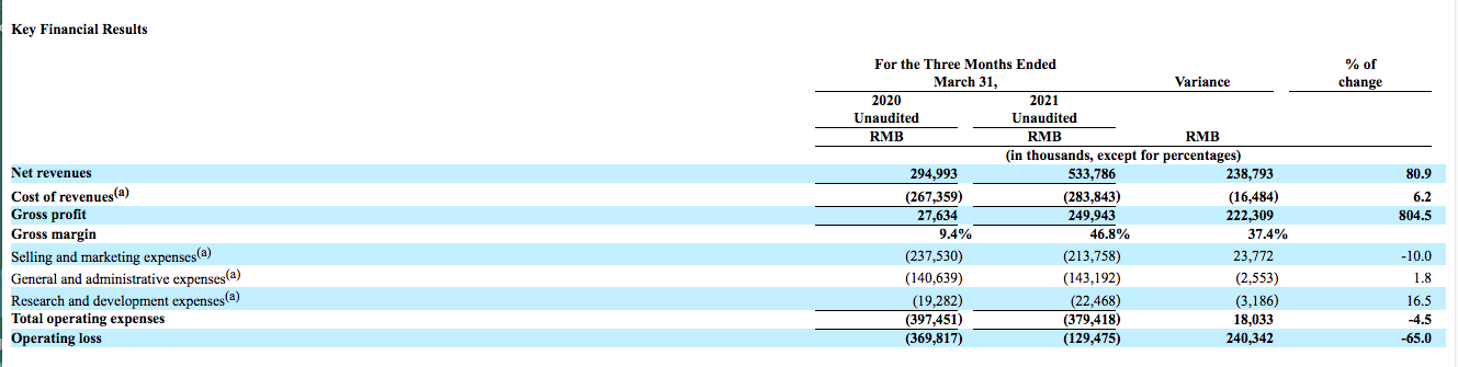 2021财年第一季度,成人教育学习中心的总数96个,去年同期为114个;K12教育学习中心的总数236个,去年同期为232个。