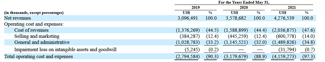新东方营收成本为20.37亿美元,同比增长28.19%,占总成本的47.6%;一般与行政成本为14.90亿美元,同比增长30.02%,占总成本的34.8%;销售与营销成本为6.01亿美元,同比增长35.06%,占总成本的14%。