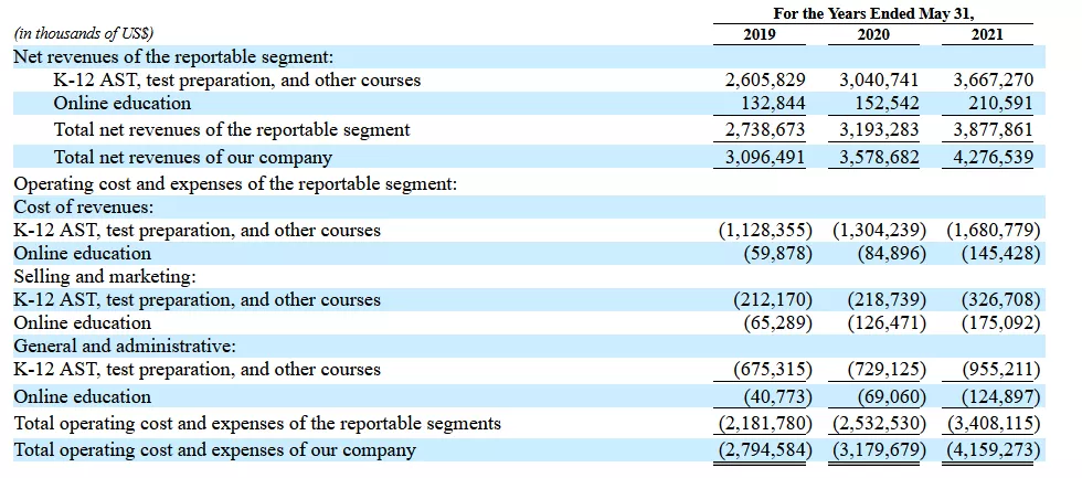 据报告披露,在截至2021年5月31日的2021财年中,大约672.3万 名学生参加了新东方针对中学生和高中学生的课外辅导课程。课程费用每门课约在500元至5000元不等。针对幼儿园和小学的儿童课外辅导课程约有534.8万名学生注册,每门费用约在300元至4000元之间。