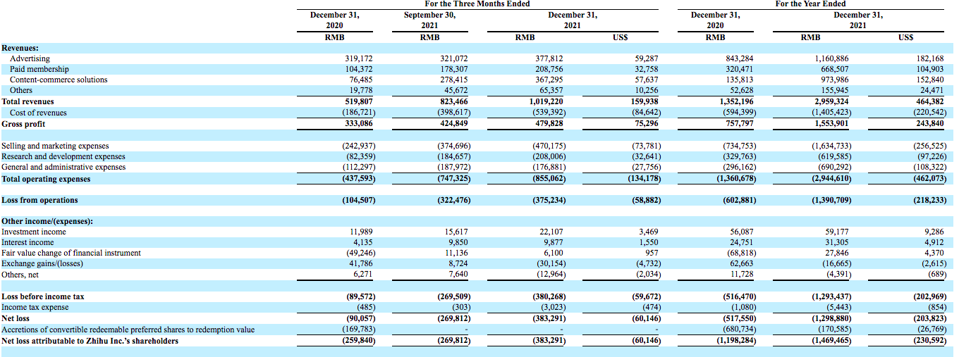 知乎CFO孙伟提到:“在2021年第四季度,我们的内容商务解决方案和付费会员业务继续快速增长,营收同比分别增长了380.2%和100.0%,共贡献了本季度总营收的56.5%。与此同时,尽管整个广告业面临着不利因素,我们的广告业务在本季度同比增长了18.4%。我们还继续受益于提供令人满意的内容和提高运营效率的承诺,实现了又一年的强劲用户基础增长和对业务合作伙伴更有吸引力的内容生态系统。到2022年,我们将继续使我们以内容为中心的盈利能力多样化,包括进一步发展我们的职业培训业务,并在我们努力确保长期和可持续增长的同时提高运营效率。”