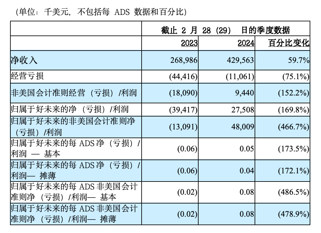 根据财报,2024 财年第四季度业绩超预期,净收入从上年同期的2.69亿美元提升到本季的4.3亿美元,同比涨幅为59.7%;归属于好未来的净利润为2750.8万美元,上年同期归属于好未来的净亏损为3941.7万美元,同比净利润涨幅为169.8%。