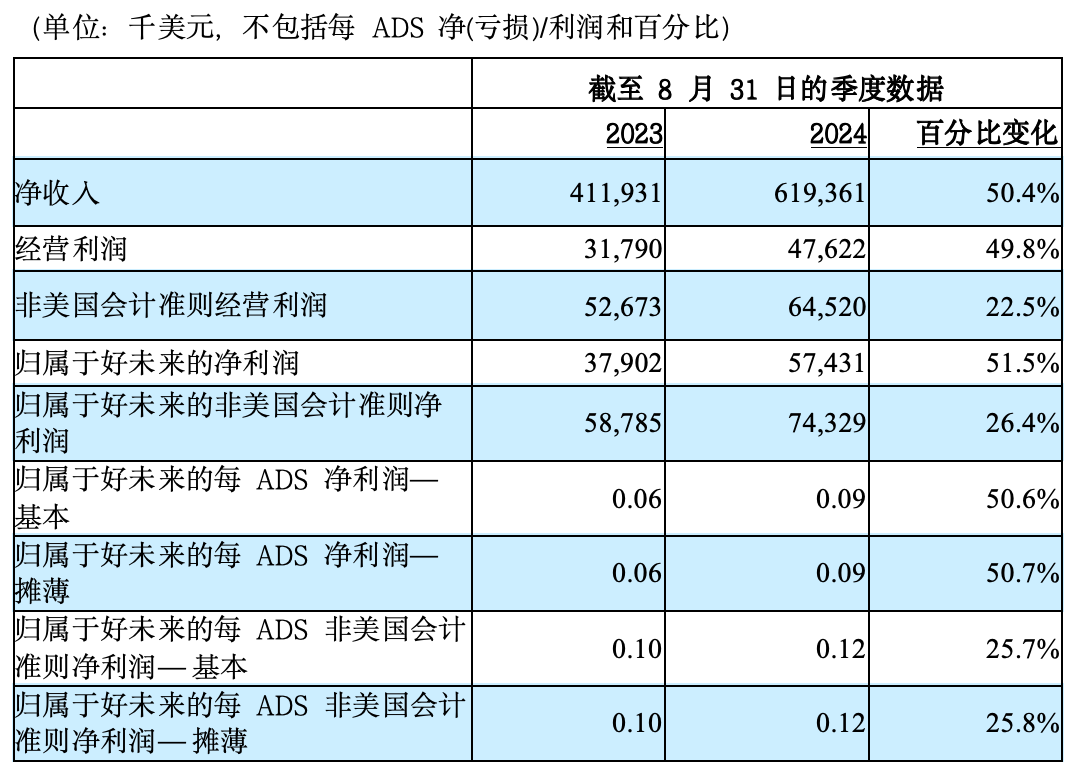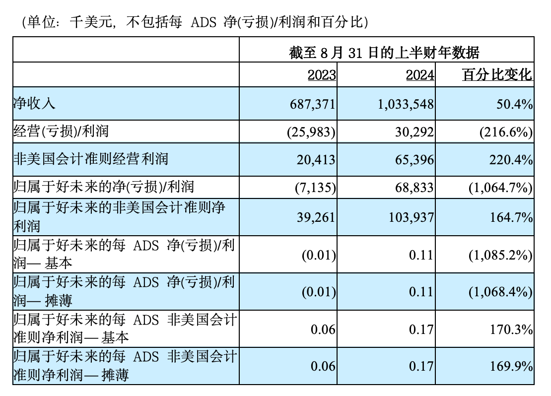 2025 财年前六个月,好未来净收入为10.335亿美元,而2024财年的前六个月好未来收入为6.874亿美元,同比增长 50.4%。