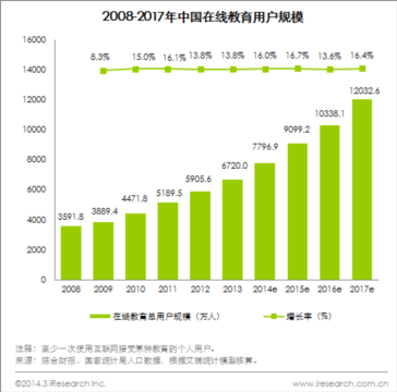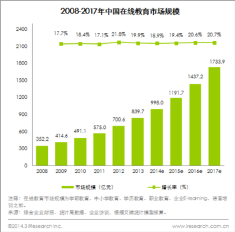 该份报告称,2014年至2017年,在线教育将每年保持20%左右的增速,在2017年达到1733.9亿。