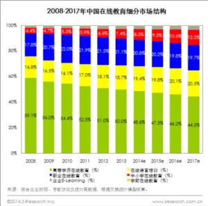 在线教育市场主要由高等学历在线教育、在线语言培训、职业在线教育、中小学在线教育等构成,报告显示,高等学历在线教育是主要构成部分,2013年占比50%,虽然未来几年它的比重在逐年下降,至2017年,它的比例依然最大,为44.3%。