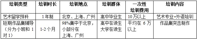 对比非艺术生,除了外语培训和留学咨询申请之外,艺术生还需要艺术专业的辅导(原因是之前两个原因造成的);而这是留学公司与外语培训机构都不能提供帮助与支持的。另外,优秀的艺术师资都集中于北京上海两地,其他省份的学生无法共享良师资源,导致大批艺术生无法申请到理想的艺术院校。