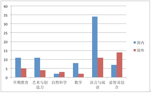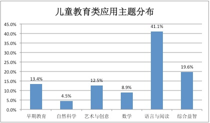 在对Apple App Store中的教育类应用进行市场分析并与美国相关调研进行对比的过程中,我们选择了热门畅销Top200的教育类应用对其主题进行了统计分析。在我们的112个儿童应用样本中,共涵盖了早期教育、艺术与创意、自然科学、数学、语言与阅读以及综合益智六个主题。