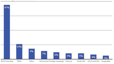 下图为美国ilearnii报告中的教育类应用主题分布,其早期教育所占比例为47%远高于其他主题,相比之下,我国市场的早期教育类的应用所占比例要低于美国。同时我们也可以看到自然科学类应用在美国市场占的比例也明显高于中国市场。