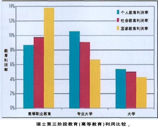 瑞士受过高等教育的人口中,有70%接受的是职业教育,只有30%接受得是非职业方向的普通教育。从职业教育经济学的角度来看,瑞士高等职业教育具有较高的教育收益,具有更高的教育“利润率”。