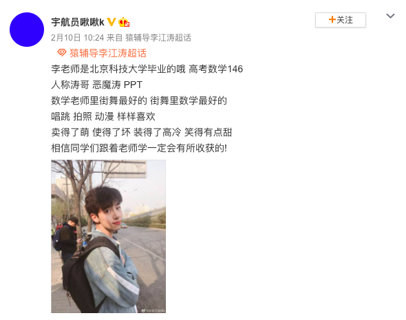 同样是以李江涛为例,该业内人士还透露李江涛本来就是一个小网红、喜欢吸猫,甚至外形还不错。猿辅导恰恰看中了这样的特质而挖其过去做数学老师。在课堂中,李江涛会用一些“猫”相关的题材吸引学生,课后也会在猿辅导APP中晒出自己的个人朋友圈。