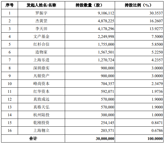 目前,各发起人的持股数量与比例如下:
