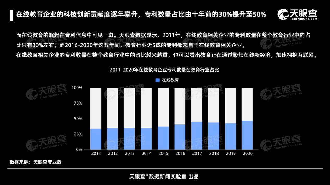 天眼查数据显示,2011年,在线教育相关企业的专利数量在整个教育行业中的占比只有30%左右。而2016-2020年这五年间,教育行业近5成的专利都来自于在线教育相关企业。