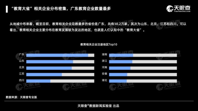 从地域分布来看,教育相关企业总数最多的省份是广东,共有38.2万家。其次为山东、北京、江苏和四川。可以看出,教育相关企业主要分布在教育发展较为发达的地区,也就是人们认知中的“教育大省”。