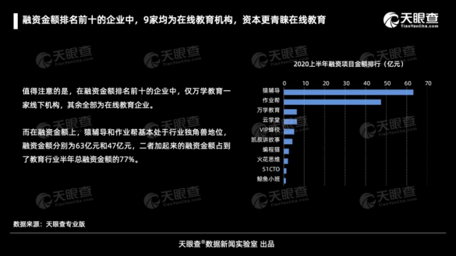 值得注意的是,在融资金额排名前十的企业中,仅万学教育一家线下机构,其余全部为在线教育企业。