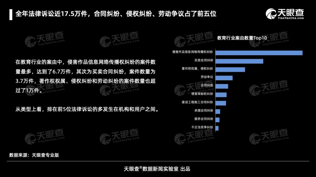 在教育行业的案由中,侵害作品信息网络传播权纠纷的案件数量最多,达到了6.7万件,其次为买卖合同纠纷,案件数量为3.7万件,著作权权属、侵权纠纷和劳动纠纷的案件数量也超过了1万件。从类型上看,排在前5位法律诉讼的多发生在机构和用户之间。