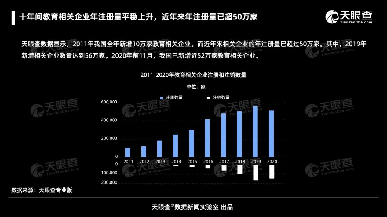 逐年来看,十年间我国教育相关企业年注册量平稳上升。天眼查数据显示,2011年我国全年新增10万家教育相关企业。而近年来相关企业的年注册量已超过50万家。其中,2019年新增相关企业数量达到56万家。2020年前11月,我国已新增近52万家教育相关企业。
