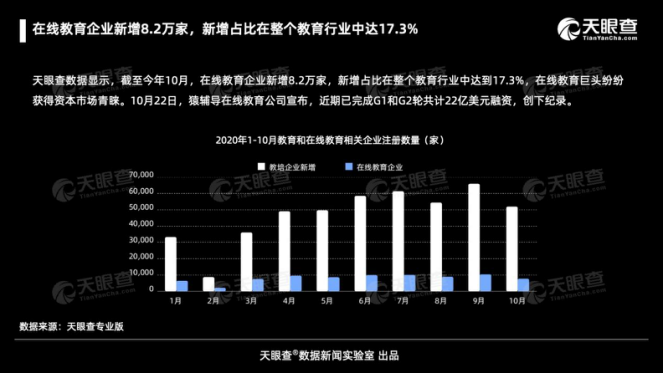 今年更是在线教育凯歌高奏的一年。天眼查数据显示,截至今年10月,在线教育企业新增8.2万家,新增占比在整个教育行业中达到17.3%。
