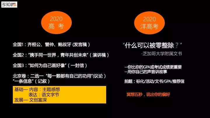 举两个考试的例子:第一个例子是2020年的高考题,任务作业和新材料作文各占千秋,这是我国的高考。另外一个,我们看一个洋高考。例如大家知道美国排名前几十的学校都需要提交文书,提交自我文书是一方面,另外要提交附加文书。