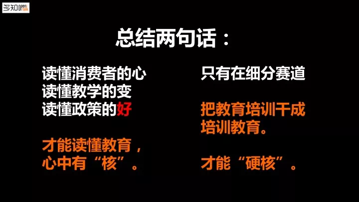 总结起来就是两句话,一是“读懂消费者的心、读懂教学的变、读懂政策的好”,任何一个政策出来以后,如果我们理解它,我们按照它的规律去实施的话,即使这个政策短期给我们带来阵痛,长期也可能让我们焕发新的机会。做到这三点也许才能读懂教育、心中有“核”,有了这个核以后在细分赛道里面把教育培训干成培训教育。