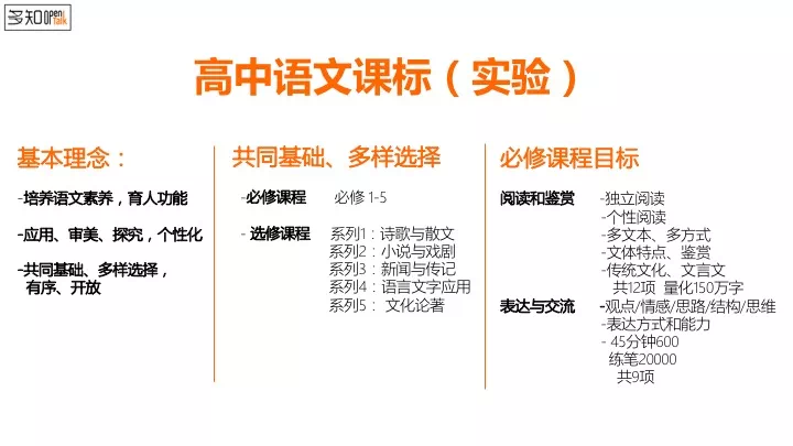 第二个叫读懂变化,这两年整个教学变化很大,无非就新课标和新高考,例如我们新课程是非常美好的,提出了应用审美探究、多样选择的语文课程体系,这个“美”结合到充满悬疑的高考可能就有一些变味了。再如全国校阅高考,第一类是文本阅读涉及学考分离,我们看教材的时候,教材理念非常美好,等到考的时候语文高考跟教材之间关系是什么?学了选修课程以后,学完以后真正在考卷上出现的只是古诗文6分是背诵了,其他的是内容积累,甚至会存在一个问题,在教学怎么安排,如果完全按照课本走可能时间不够。所以课程改革也好,新高考改革也好,给所有行业同事提供了创新机会。
