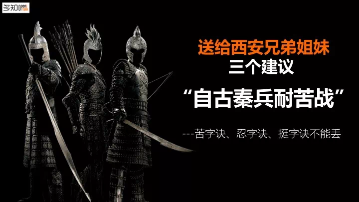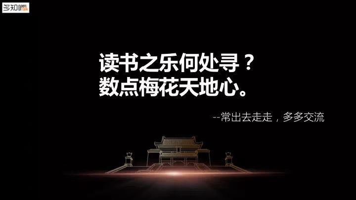 第二个“读书之乐何处寻?数点梅花天地心”,在宋朝的时候有一个北宋五子,很重要的一个是陕西的代表是张载,他创造的官学,陕西对于我们来讲是有文化底蕴,陕西是华夏文明从甘肃到陕西,再走出去的过程。所以陕西是有文化底蕴的,另外一方面也有自己的特点,不太爱出去走走,不太爱到外头学习,开放的心态不够。多知论坛的名字叫做OpenTalk,你要有OpenTalk,首先你要有开放的头脑,OpenMind。
