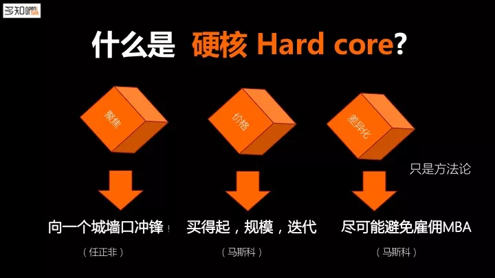 未来10年对我来讲,不谈商业模式,我只谈教学,只谈两个字叫“硬核”。什么是硬核?所有的钱、商业模式、技术、和人跟硬核相关,但是它只是硬核的资源,而不是硬核的本身。聚焦、价格、差异化,是波特竞争战略里面经常讲的,你怎么样跟人竞争?陕西有一句话叫做“茄子一行,辣子一行”,我就种茄子,我把茄子种好,这个叫做聚焦。价格我就给你偏移,差异就是,我把茄子洗一下,上面还给它带个花,这个是最常见的竞争战略。
